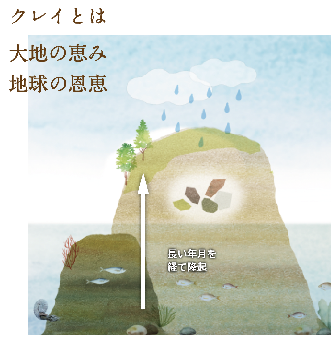 粘土は太古の地球に降り積もった火山灰の堆積物が、数百万年~2億年という長い年月の間に、地殻変動や環境変化などの影響を経てできた大地の恵みです。